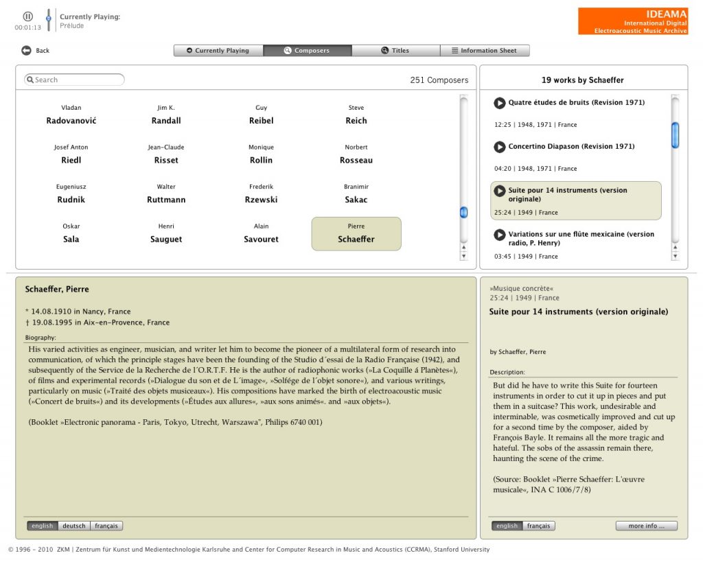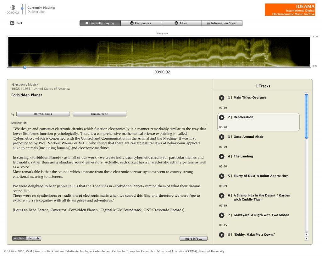Development of an interface for the International Digital Electro-Acoustic Music Archive (IDEAMA) in 2010/2011. The exhibition software allowed visitors to browse the archive and listen to the works of electro-acoustic music. A sonogram view displayed the timeline frequencies and allowed for quick access to particular parts of each title. An underlying database gave editors the freedom to edit and update the archive. The custom exhibition software has been used for various other archives including the archive for the Giga-Hertz prize winners. Exhibited at the ZKM | Centre for Art and Media.