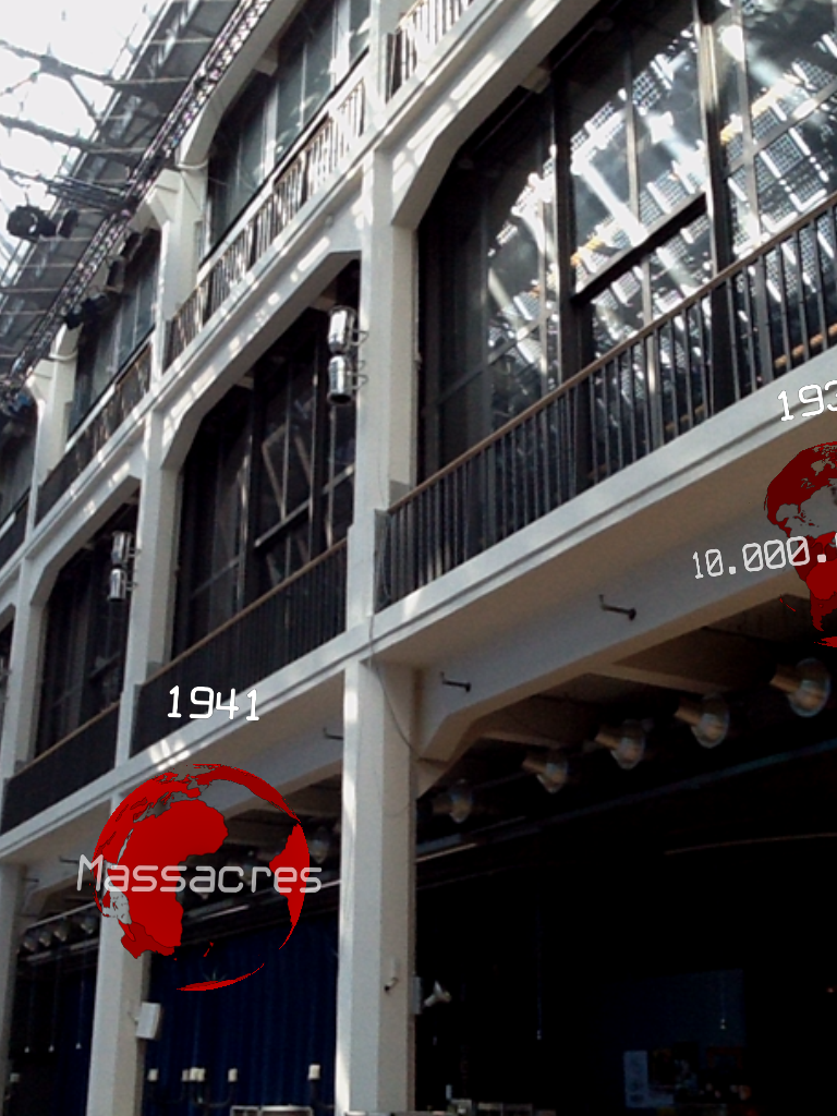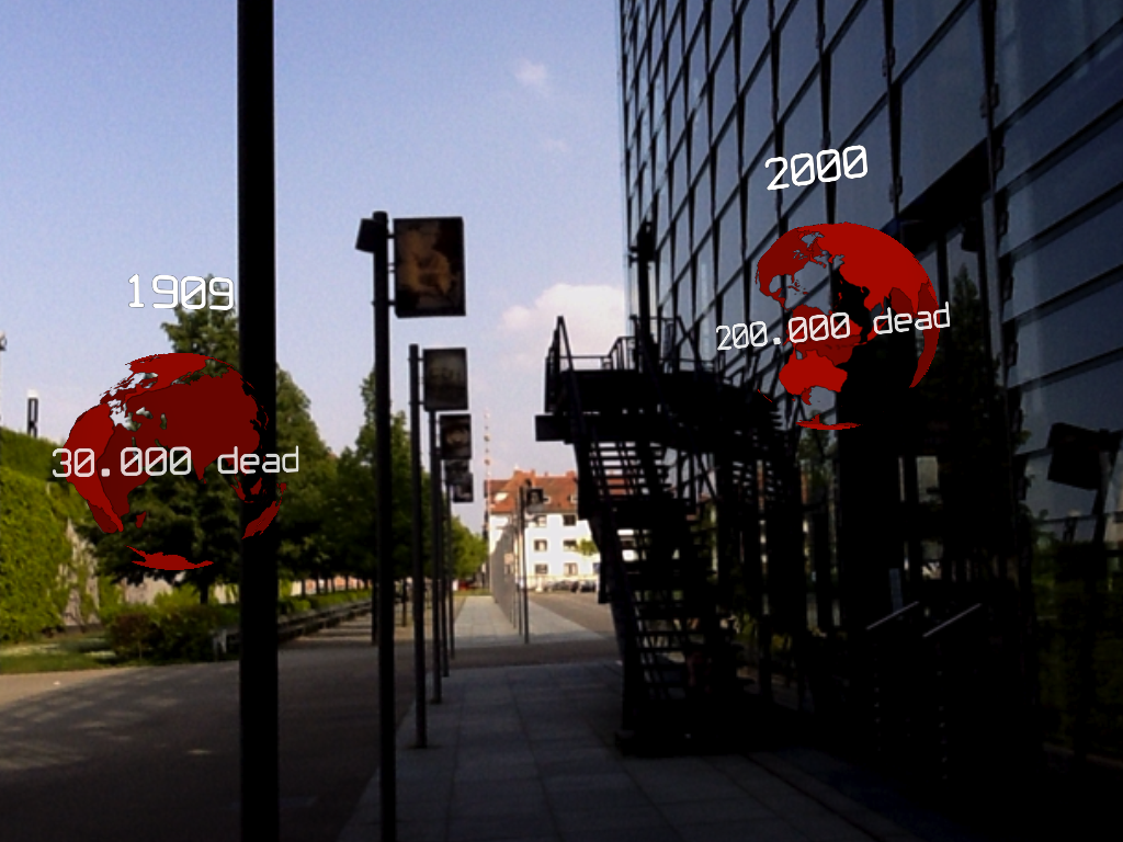 For Peter Weibel I developed this augmented reality installation for mobile devices back in 2011. Surrounded by ten floating globes, each representing a decade of the last century, users are confronted with the numbers of people killed due to genocides, political murders and wars. Each conflict appears in chronological order as written and spoken text in three different languages: english, french and german.