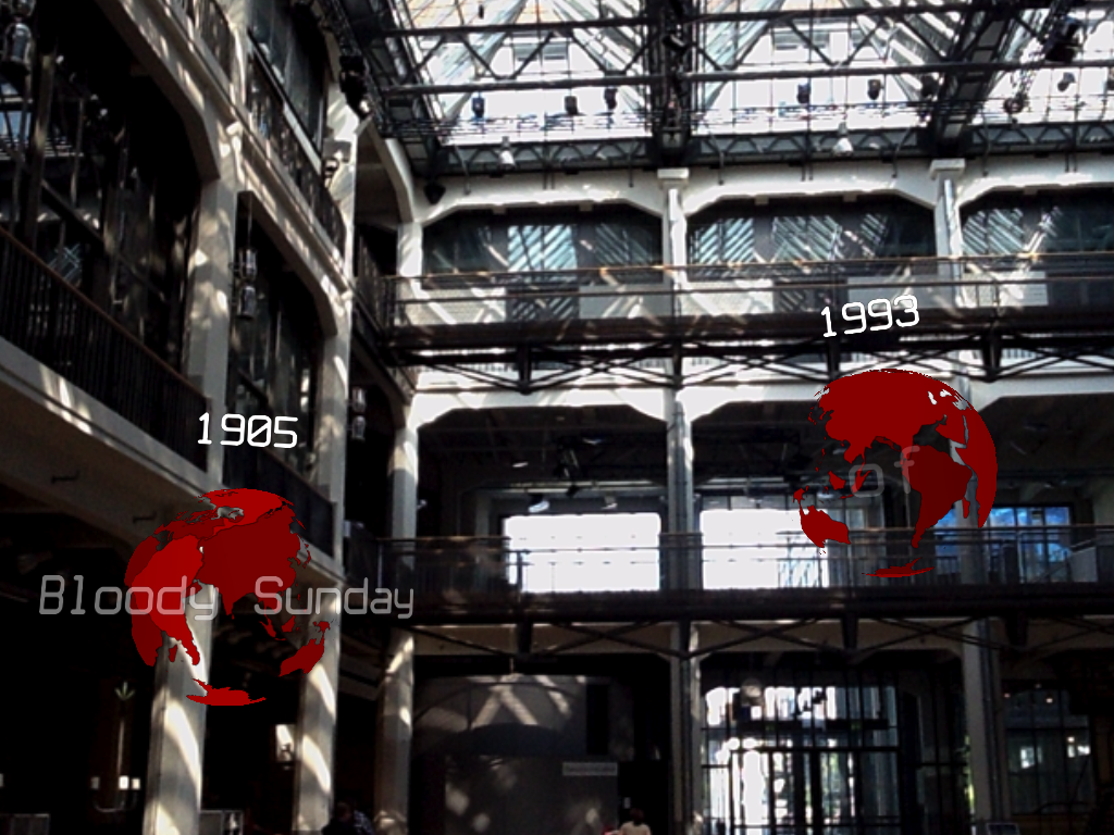 The viewer, wandering around in real space, may wonder, why he sees and hears a chronology of genocides, political murders and wars happening so close to him, not being distant, happening in his own space. The answer could be that he is part of the system that he observes, that he is part of the system where he lives in, that the system of which he is part is also part of genocides and wars. His local world is part of the global world. Inseparability is the name of the game. Maybe he wonders why natural catastrophes have only destroyed an extremely small number of people whereas man-made catastrophes have destroyed the lives of millions of people. In what kind of social system do we live that kills each year 2 million two hundred thousand people?